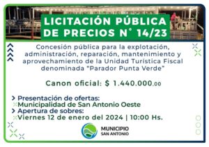 El Municipio San Antonio realiza el Llamado a Licitación Pública N°014/2023, que tiene por objeto el otorgamiento de la concesión pública para la explotación, administración, reparación, mantenimiento y aprovechamiento de la Unidad Turística Fiscal denominada “Parador Punta Verde” de San Antonio Oeste.