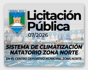 La Municipalidad de General Roca llama a Licitación Pública Nº 07/2026, correspondiente a la “Contratación de mano de obra, provisión de materiales, maquinarias y equipos necesarios para la ejecución del sistema de climatización del Natatorio del Centro Deportivo Municipal de la Zona Norte de la ciudad de General Roca”.