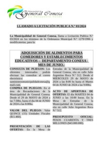 La Municipalidad de General Conesa realiza el llamado a Licitación Pública para: “Adquisición de alimentos para comedores y establecimientos educativos-Mes de junio.