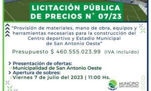 El Municipio San Antonio realiza el Llamado a Licitación Pública N°007/2023, que tiene por objeto la provisión de materiales, mano de obra, equipos y herramientas necesarias para la construcción del Centro deportivo y Estadio Municipal de la localidad de San Antonio Oeste.