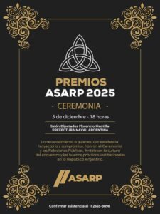 La Asociación Argentina de Ceremonial y Protocolo (ASARP) celebrará la primera edición de los Premios ASARP, un reconocimiento inédito a figuras, instituciones y equipos que sostienen el orden simbólico y la comunicación institucional del país. La ceremonia se realizará el viernes 5 de diciembre de 2025 a las 18 h, en el Salón Diputado Florencio Mantilla de la Prefectura Naval Argentina (Edificio Guardacostas, CABA), con la presencia de autoridades nacionales, representantes académicos y organismos públicos y privados.