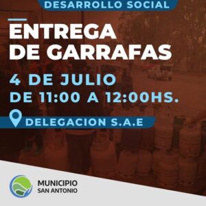 La Secretaría de Desarrollo Social informa que el jueves 4 de julio a partir de las 11:00 y hasta a las 12:00 hs, se realizará la entrega de garrafas sociales a las familias empadronadas del Puerto San Antonio Este.