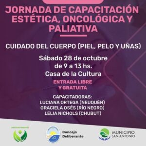El sábado 28 de octubre de 9:00 a 13:00 hs, en la Casa de la Historia y la Cultura, se realizará una jornada de Capacitación Estética, Oncológica y Paliativa, para el cuidado del cuerpo (piel, pelo y uñas).