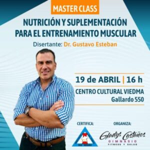 Organizada por la campeona mundial en Fitness Gladys Castaños, el 19 de abril del 2023, el Doctor Gustavo Esteban brindará en el Centro Cultural de la ciudad de Viedma una Master Class sobre Nutrición y Suplementación para el Entrenamiento Muscular.