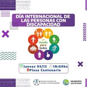 El Consejo local de Personas con Discapacidad invita el día 3 de diciembre con motivo del Día Internacional de las Personas con Discapacidad, a las 18 hs, en la Plaza Centenario a toda la comunidad a sumarse a las actividades.