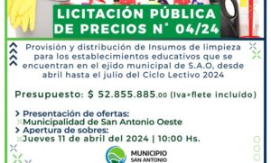 El Municipio San Antonio informa que de acuerdo al Decreto N°350, con fecha 5 de abril 2024, se han realizado modificaciones en el Pliego de Bases y Condiciones de la Licitación Pública N°004/2024, que tiene por objeto “provisión y distribución de Insumos de limpieza para los establecimientos educativos que se encuentran en el ejido municipal de San Antonio Oeste, desde el mes de abril hasta el mes de julio del Ciclo Lectivo 2024”, según convenio suscripto entre el Ministerio de Educación de la Provincia de Río Negro y la Municipalidad de San Antonio Oeste.