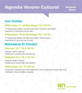 Esta semana, en el marco del Verano Cultural, la Secretaría de Estado de Cultura ofrecerá diversas actividades para toda la familia en el Balneario El Cóndor, Las Grutas, El Bolsón y Valcheta.