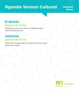 Allí también el próximo miércoles estará presente el Cinemóvil, un clásico del Verano Cultural que en esta oportunidad llegará con la película argentina “En la cabeza de papá” dirigida por Walter Tejblum; y el jueves arribará a Valcheta con las películas “La Gallina Turuleca” y “Karnawal”.