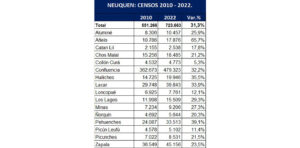 Neuquén pasó de los 551.266 habitantes que tenía en 2010 a los 726.590 que arrojó el censo de mayo último. La variación fue de 175.324 personas, lo que se traduce en un crecimiento del 31,8%. Esto la ubicó segunda detrás de Tierra del Fuego, Antártida e Islas del Atlántico Sur, que pasó de 127.205 habitantes en 2010 a 190.641, en 2022. Su crecimiento fue de 63.436 personas lo que significa un 49,9%.