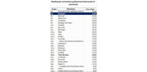 En el ranking nacional de crecimiento, le siguen a Neuquén estas provincias: San Luis (25,1%), Santa Cruz (21,7%) y Corrientes (20,6%). El censo también arrojó que la Argentina pasó de los 40.117.096 habitantes que tenía en 2010 a 46.044.703 en 2022, lo que indica un crecimiento de 5.927.607 personas que se traduce en 14,8%. En el mismo lapso, la ciudad de Buenos Aires pasó de 2.890.151 a 3.120.612 habitantes (8%) y la provincia de Córdoba de 3.308.876 a 3.978.984 habitantes (20,3%).