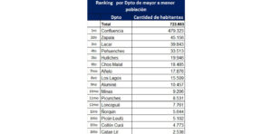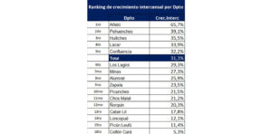 En lo que hace al ranking provincial, los departamentos que mayor crecimiento registraron en porcentajes son los siguientes: Añelo (en el área central de Vaca Muerta) 65,7%, Pehuenches (Rincón de los Sauces) 39,1%, Huiliches (Junín de los Andes) 35,5%, Lácar (San Martín de los Andes) 33,9% y Confluencia (Neuquén capital) 32,2%.