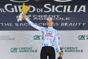 Maglia Bianca (Blanca), líder de la Clasificación Young Riders, nacida después del 01/01/1998, patrocinada por Crédit Agricole – Finn Fisher-Black (UAE Team Emirates) vestida por Thomas Pesenti (Beltrami TSA – Tre Colli)