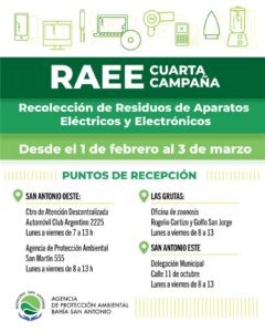 La Agencia de Protección Ambiental Bahía San Antonio informa que se encuentra en marcha la cuarta campaña de Recolección de Residuos de Aparatos Eléctricos y Electrónicos desde el 1 de febrero al 3 de marzo.