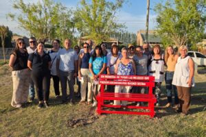General Roca. – En el marco del Día Internacional de la Eliminación de la Violencia Contra la Mujer, la Intendenta María Emilia Soria acompañó a estudiantes y docentes del Anexo N° 4 de la Escuela EEBA N° 7 en la colocación de un nuevo “Banco Rojo” en la plaza del barrio Chacramonte.