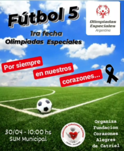 El 30 de Abril de este año Catriel fue sede de la 1ra. fecha de Fútbol 5 de Olimpiadas Especiales. La organización estuvo a cargo de la Fundación Corazones Alegres de Catriel y se llevó a cabo en instalaciones del SUM Municipal.