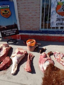 Durante el dispositivo de seguridad, apostado en el ingreso a la cantera sobre Ruta 6, los uniformados divisaron una camioneta y al momento de realizar el control encontraron en la caja del rodado un novillo completo sin las medidas sanitarias y sin refrigeración.