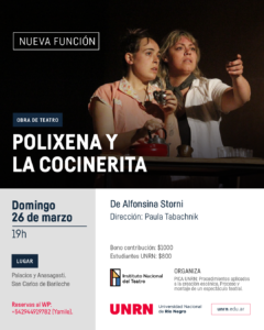 Bariloche. -La obra dirigida por Paula Tabachnik y la supervisión de Aldo Pricco lleva 6 funciones a sala llena en Bariloche. Con la intención de permitir la asistencia a más público, la Sede Andina de la Universidad Nacional de Río Negro invita a la comunidad a disfrutar de una nueva presentación de la obra teatral “Polixena y la cocinerita” de Alfonsina Storni.