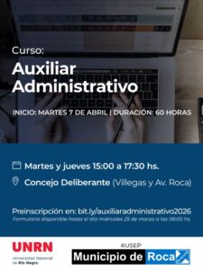 Roca – Se encuentra abierta la preinscripción al curso “Auxiliar Administrativo”, organizado por USEP del Municipio de Roca en conjunto con la Universidad Nacional de Río Negro (UNRN), a través de la Subsecretaría de Extensión de la Sede Alto Valle – Valle Medio.