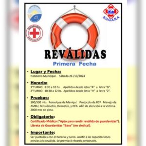 El Cuerpo Municipal de Guardavidas, dependiente de la Dirección de Gobierno, informa que la primera fecha de Reválidas (son pruebas que sirven para determinar las aptitudes físicas de los guardavidas), será el sábado 26 de octubre en el Natatorio Municipal de San Antonio Oeste.