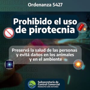 El Municipio San Antonio recuerda que se encuentran vigente las Ordenanzas 5.427 y sus modificaciones, que prohíben la venta y uso de pirotecnia y/o fuegos artificiales a los fines de preservar la salud de las personas y evitar daños en los animales y en el ambiente.