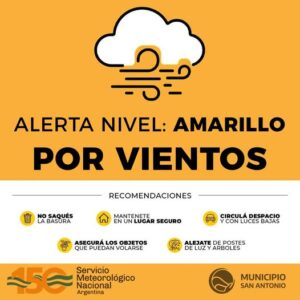El Servicio Meteorológico Nacional emitió pronóstico de alerta amarilla en nuestra zona para la tarde del 17 de enero, noche y madrugada del 18 de enero, que prevee vientos del noreste con velocidades entre 30 y 45 km/h con ráfagas que pueden superar los 80 km/h. (Fuente:  Servicio Meteorológico Nacional)