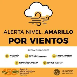 El Servicio Meteorológico Nacional emitió pronóstico de alerta amarilla en nuestra zona para la mañana y tarde del 26 de junio, que prevee vientos del sector oeste con velocidades entre 45 y 60 km/h con ráfagas que pueden superar los 100 km/h. (Fuente:  Servicio Meteorológico Nacional)