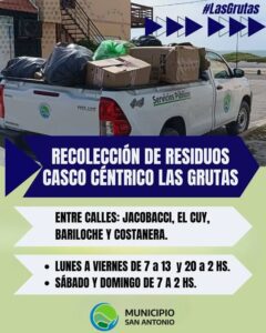 Desde el Municipio de San Antonio se recuerda a vecinos y comerciantes del casco céntrico de Las Grutas que el servicio de recolección de residuos se realiza en las zonas de Jacobacci, El Cuy, Bariloche y Costanera.