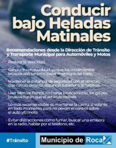 General Roca. – Desde la Dirección de Tránsito y Transporte del Municipio de Roca se emiten las siguientes recomendaciones, para conducir bajo situaciones de heladas matinales o muy bajas temperaturas registradas en la ciudad: