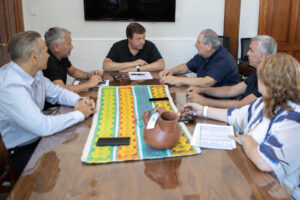 Del encuentro participaron los ministros de Gobierno, Trabajo, Modernización y Turismo, Federico Lutz; de Hacienda, Gabriel Sánchez; la secretaria de la Función Pública, Tania Lastra; y el presidente del bloque de legisladores de Juntos Somos Río Negro, Facundo López.