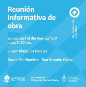 A través del programa RENABAP (Registro Nacional de Barrios Populares) de acceso a servicios públicos, el día viernes 15/09 a las 11:30 hs en la Plaza “Los Peques”, se desarrollará la segunda Mesa Integral Barrial (MIB), instancia participativa para transmitir y resolver consultas junto a los vecinos sobre la obra en ejecución.