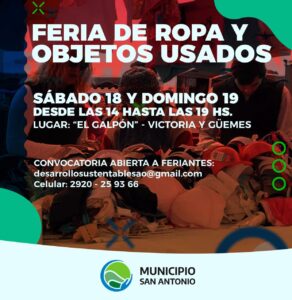La Subsecretaría de Desarrollo Sustentable del Municipio San Antonio, comunica que el sábado 18 y domingo 19 de mayo, de 14:00 a 19:00 hs en “El Galpón” (Victoria y Güemes, SAO), se realizará la Feria de Ropa y Objetos Usados la cual tiene su convocatoria abierta para aquellos que quieran ser parte de la misma.