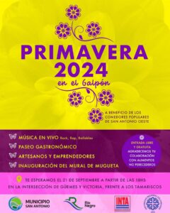 Y finalmente, con motivo de celebración por la Primavera 2024, a las 18:00 iniciarán las actividades con música en vivo, paseo gastronómico, artesanos y emprendedores, y la inauguración del mural de Mugueta. La entrada es libre y gratuita, agradeciendo la colaboración de un alimento no perecedero que será donado a comedores de la ciudad.