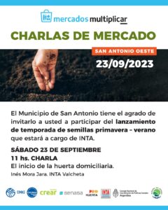 La Agencia de Protección Ambiental Bahía San Antonio, conjuntamente con el Instituto Nacional de Tecnología Agropecuaria, invita a referentes de juntas vecinales y propios vecinos a participar del “Lanzamiento de Temporada de Semillas Primavera-Verano” que se realizará este sábado 23 de septiembre a las 11:00 hs en el pedio del Mercado MultiplicAR, ubicado entre las calles Victoria y Güemes de San Antonio Oeste (frente al Balneario Los Tamariscos).