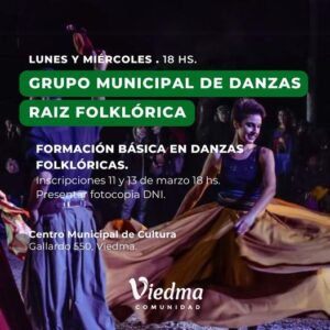Viedma.- El 11, 13 y 15 de marzo a partir de las 18hs, se encontrarán abiertas las inscripciones para el Taller de Folclore, formación básica para ser parte del Elenco Estable Municipal de danzas De Raíz Folklórica en el Centro Municipal de Cultura.