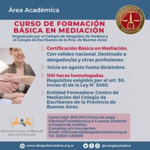 El Colegio de Abogados de Viedma informa que se encuentra abierta la inscripción para el Curso de Formación Básica en Mediación que se dictará en la capital provincial a partir del 3 de agosto en la sede de ese colectivo profesional, en calle 25 de Mayo 647 Piso 1° en coordinación con el Centro de Mediación del Colegio de Escribanos de Buenos Aires.