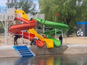 Este nuevo espacio recreativo contará con diversas atracciones para el disfrute de vecinos/as y turistas, consolidando el Balneario como un destino ideal para la temporada estival. Actualmente, y finalizada la instalación de los juegos para los más chiquitos en la margen sur del pileton, se está trabajando en la instalación de la Torre Acuática y el Tobogán de tres cuerpos.