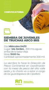 Este miércoles desde las 10 en la Isla Jordán, a unos 200 metros aguas arriba de la balsa vieja, se desarrollará la liberación de 150.000 alevinos de trucha arco iris en el marco del programa de Recuperación del Recurso Ictícola. El evento incluye charlas explicativas relacionadas con la siembra a cargo de los guardapescas de la Mesa de Pesca del Alto Valle.