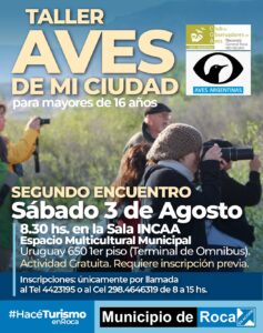 El Municipio junto al Club de Observadores de Aves de Roca (C.O.A Roca), ofrecen la segunda etapa del Taller “Aves de mi ciudad” para el próximo sábado 3 de agosto. Abierto al público local, está destinado a aquellas personas que aún no se han iniciado en la observación de aves y siente la curiosidad de reconocer las especies que podemos encontrar en lo cotidiano.