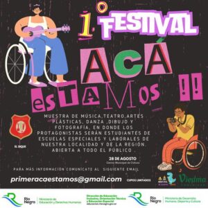 El miércoles 28 de agosto, de 9hs a 17hs, se realizará una muestra de música, teatro, artes plásticas, danza, dibujo y fotografía, en donde los protagonistas serán estudiantes de escuelas especiales y laborales de Viedma y la región.