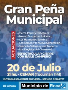 Peña Municipal del año, con una variada grilla de músicos locales que harán una gran peña baile con un fabuloso cierre con baile campero. El Municipio de Roca, a través de la Dirección de Cultura, organiza la primer