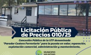 El Municipio San Antonio realiza el Llamado a Licitación Pública N°010/2025, que tiene por objeto otorgamiento en Concesión Pública de la unidad turística fiscal denominada “Parador Costero Ferroviario” para la puesta en valor, reparación, explotación comercial, administración y mantenimiento, ubicada en la costanera de San Antonio Oeste.