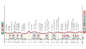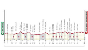 A pocos kilómetros se encuentra el sector 2 (5,8 km); Esta será la primera parte complicada de la carrera, con un breve descenso seguido de una larga subida con tramos superiores al 10%. Al llegar a Radi, el recorrido pasa por el tercer sector de tierra (4,4 km de longitud; es decir, la segunda parte del primer tramo de tierra de la primera edición de la carrera), seguido poco después por el sector 4, denominado “La Piana”, uno de los clásicos de la carrera. Sectores de tierra (de 5,5 km de longitud, presentes en el recorrido desde la primera edición) sin desnivel importante, hasta llegar a Buonconvento. A pocos kilómetros se encuentra la subida al Montalcino, segunda ascensión del día (4 km al 5%). Los sectores 5 (11,9 km) y 6 (8 km) comienzan nada más pasar Torrenieri, con sólo 1 km de asfalto entre ellos. Ambos son duros, montañosos y con mucha garra, con muchas curvas, subidas y descensos desafiantes. Después del segundo paso por Buonconvento, los corredores llegarán al avituallamiento, situado en los alrededores de Ponte d’Arbia. Poco después el recorrido llega a Monteroni d’Arbia, que marca el inicio del sector 7 de San Martino in Grania (9,5 km), en plena Crete Senesi. Es un sector largo marcado por una secuencia de suaves ondulaciones en la primera parte, y que finaliza con una subida sinuosa que devuelve a la carretera asfaltada. El sector 8 comienza en Ponte del Garbo (Asciano). Con 11,5 km, es el más duro de la carrera, principalmente cuesta arriba y marcado por importantes pendientes, especialmente cerca del Monte Sante Marie, con fuertes pendientes tanto en subidas como en bajadas en distancias cortas. Pasado Castelnuovo Berardenga hay un tramo llano muy corto sin asfaltar (300 m) seguido por el noveno sector de tierra, después de Monteaperti. Con sólo 800 m de longitud, saluda a los ciclistas con pendientes de dos dígitos. El recorrido vuelve al asfalto en Vico d’Arbia, donde comienza el circuito de 30 km. Pasada Pieve a Bozzone, sigue el sector 10 (2,4 km), en subida hacia Colle Pinzuto, con pendientes que llegan al 15%. Al cabo de algunos kilómetros, el recorrido llega al undécimo sector, Le Tolfe (1,1 km), marcado por un rápido descenso seguido de una subida muy dura (con una pendiente máxima del 18%). Poco después de Le Tolfe, en el primer paso, la ruta toma por primera vez la Strada del Castagno (sector 12, 1,3 km), que conduce a algunos pasos exigentes sobre asfalto hasta Pontignano, Ponte a Bozzone y San Giovanni a Cerreto, donde entramos en el sector 13 (Montechiaro 3,3 km), recorrido en las primeras ediciones de la carrera. El circuito finaliza al final de este sector, en Vico d’Arbia. Los sectores de Colle Pinzuto (14º) y Le Tolfe (15º) se repetirán antes de que la ruta gire hacia Siena a poco más de 10 km de la meta.