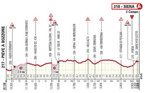 Los exigentes últimos kilómetros se acercan a la ciudad de Siena por carreteras anchas y rectas, conectadas por amplias curvas, inicialmente cuesta abajo y más adelante ligeramente cuesta arriba. A 2 km de la meta, el recorrido toma la Via Esterna di Fontebranda; aquí la pendiente roza el 9%. El empedrado comienza 900 m antes de la meta, nada más pasar la Puerta de Fontebranda. La pendiente es superior al 10% hasta 500 m de la meta, alcanzando su pendiente más pronunciada del 16% a lo largo de Via Santa Caterina. Un giro brusco a la derecha conduce a Via delle Terme y luego a Via Banchi di Sotto. A partir de los 300 m hasta la meta, el camino es un ascenso ligero y continuo. A 150 m del final, giramos a la derecha en Via Rinaldini. El recorrido entra en la Piazza del Campo a sólo 70 m de la meta. Los últimos 30 m descienden con una pendiente del 7% hasta la meta, que está en carretera llana.