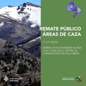 El Parque Nacional Nahuel Huapi comunica la fecha de la próxima subasta de Cotos de Caza correspondientes a la temporada 2025, a realizarse el viernes 29 de noviembre a las ONCE HORAS (11:00 hs.) en el Centro de Convenciones de Villa Traful. Se informan los turnos, áreas y bases determinadas para la Temporada de Caza 2025 en el Jurisdicción del PNNH.