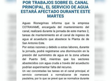Aguas Rionegrinas informa que este martes 2 de diciembre se realizarán trabajos de mantenimiento sobre el canal principal que abastece a la Planta de San Antonio Este.