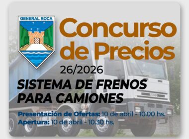La Municipalidad de General Roca llama a Concurso de Precios Nº 26/2026, correspondiente a la “Compra de repuestos de sistema de frenos para camiones”.