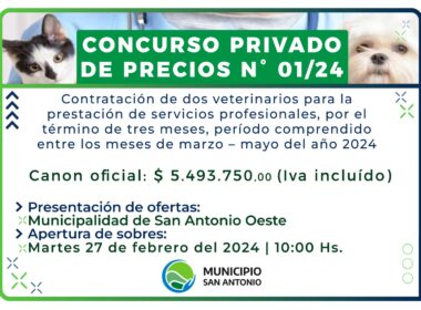 El Municipio San Antonio realiza el Concurso Privado de Precios N° 001/2024 que tiene por objeto la contratación de dos (2) veterinarios para la prestación de servicios profesionales, por el término de tres (3) meses, período comprendido entre los meses de marzo – mayo del año 2024.