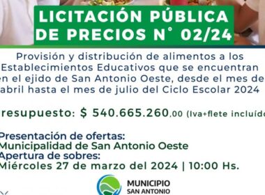 El Municipio San Antonio realiza el Llamado a Licitación Pública N°002/2024, que tiene por objeto la “provisión y distribución de alimentos a los Establecimientos Educativos que se encuentran en el ejido municipal de San Antonio Oeste, desde el mes de abril hasta el mes de julio del Ciclo Escolar 2024”.