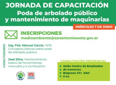 La Agencia de Protección Ambiental Bahía San Antonio y la Secretaría de Servicios Públicos informan que el próximo miércoles 07 de junio se llevará adelante una jornada de “Capacitación de poda de arbolado público y mantenimiento de maquinarias” destinada a agentes municipales y público en general.