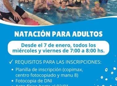 A través de la Dirección de Deportes se informa que se encuentran abiertas las inscripciones para las clases de Natación para Adultos con profesor, que comenzarán el 7 de enero en el Natatorio Municipal de San Antonio Oeste.